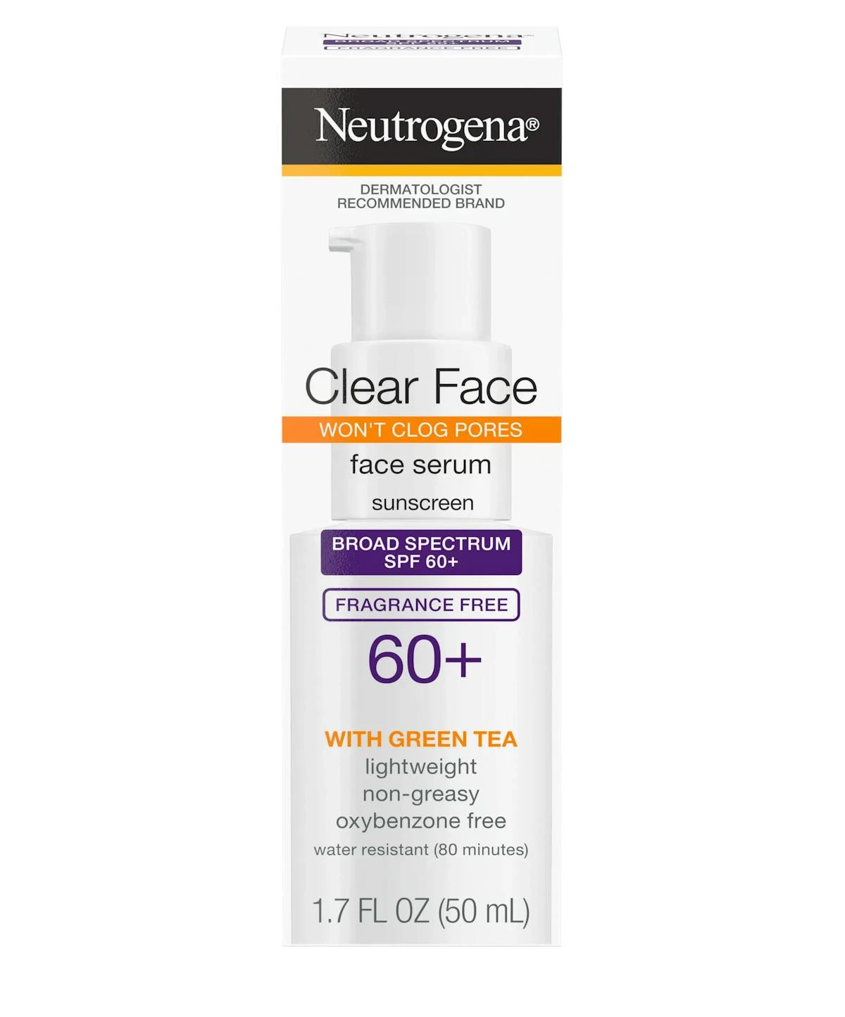 Neutrogena® Clear Face Serum Sunscreen with broad spectrum SPF 60+ helps prep skin for makeup and preserve its natural moisture barrier while guarding against the sun. Formulated with Helioplex® Technology, this sunscreen serum helps prevent sunburn and provides broad spectrum UVA/UVB protection to help fight signs of aging due to UV exposure such as wrinkles, dark spots, fine lines and sagging.