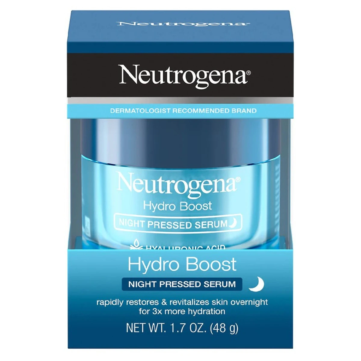 Wake up to smooth, supple skin that’s three times more hydrated with Neutrogena Hydro Boost Hyaluronic Acid Night Pressed Serum. From a dermatologist-recommended brand and suitable for all skin types, the concentrated pressed serum is clinically proven to revitalize and restore your skin’s moisture barrier overnight. The multi-restorative formula melts into skin to intensely hydrate deep within the surface. Formulated with purified hyaluronic acid and supercharged antioxidants that are known to help fight daily aggressors, this smoothing night serum complements skin’s natural nighttime renewal process. The non-greasy serum is oil-free, alcohol-free, and non-comedogenic, which means it won’t clog pores or cause breakouts. To use, apply the hydrating serum generously to face and neck and leave on overnight. For best results, use Neutrogena Hydro Boost Night Pressed Serum as part of a hydrating at-home skincare routine. Use at night after cleansing with Hydro Boost Hydrating Cleanser.