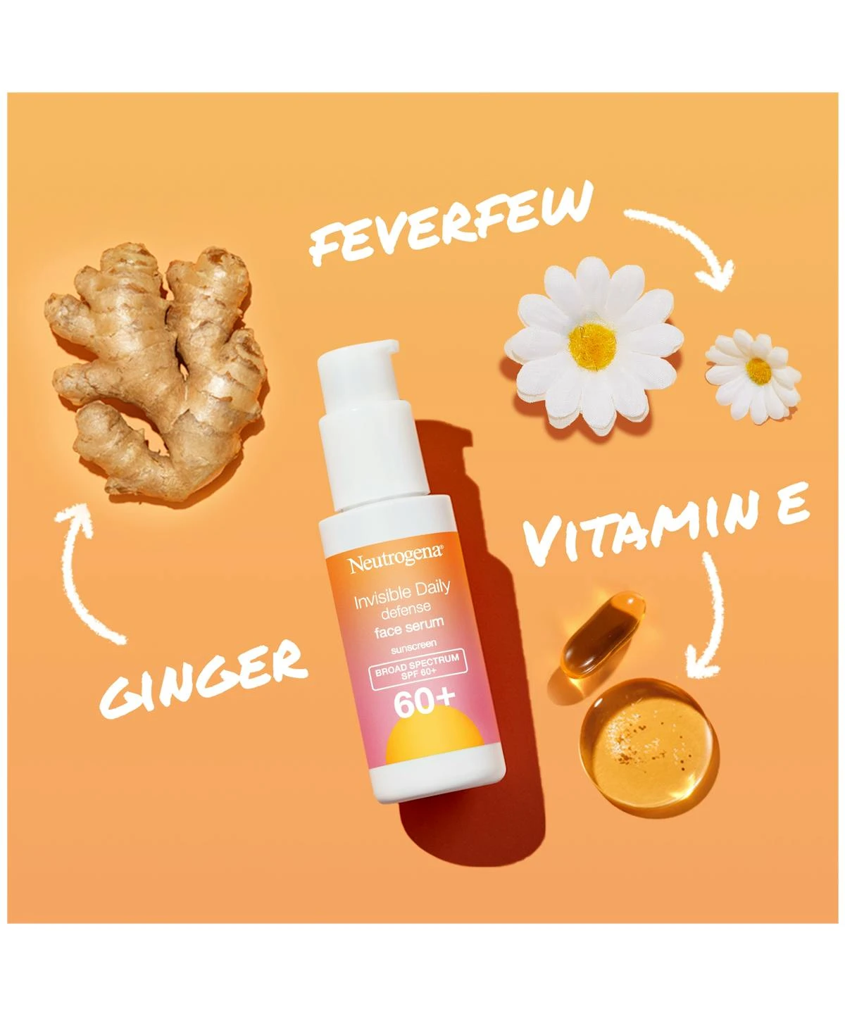 Take protection to the next level with NEW multi-tasking Neutrogena Invisible Daily™ Defense Face Serum with SPF 60+. This innovative formula is invisible on all skin tones, leaving skin feeling soft and smooth with no white cast. Developed with broad spectrum UVA/UVB protection and antioxidants, this hydrating serum works double duty to help fight against environmental aggressors like the sun, cold, ozone and pollution, while enhancing skin’s natural radiance.