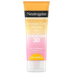 - Neutrogena Invisible Daily Defense hydrating sunscreen lotion for face and body with SPF 30 Sunscreen lotion helps prevent sunburn and provides broad spectrum UVA/UVB protection Also helps fight against wrinkles, dark spots, fine lines, and sagging due to sun exposure Hydrating lotion boosts skin’s natural moisture barrier, leaving it looking radiant and renewed Antioxidant helps combat skin-damaging environmental aggressors like cold, ozone, & pollution Lightweight lotion rubs in invisibly on all skin tones without white marks Water- and sweat-resistant up to 80 minutes; free from oxybenzone, parabens, and mineral oil Quick-drying face and body sunscreen suitable for daily use to help protect skin from sun exposure