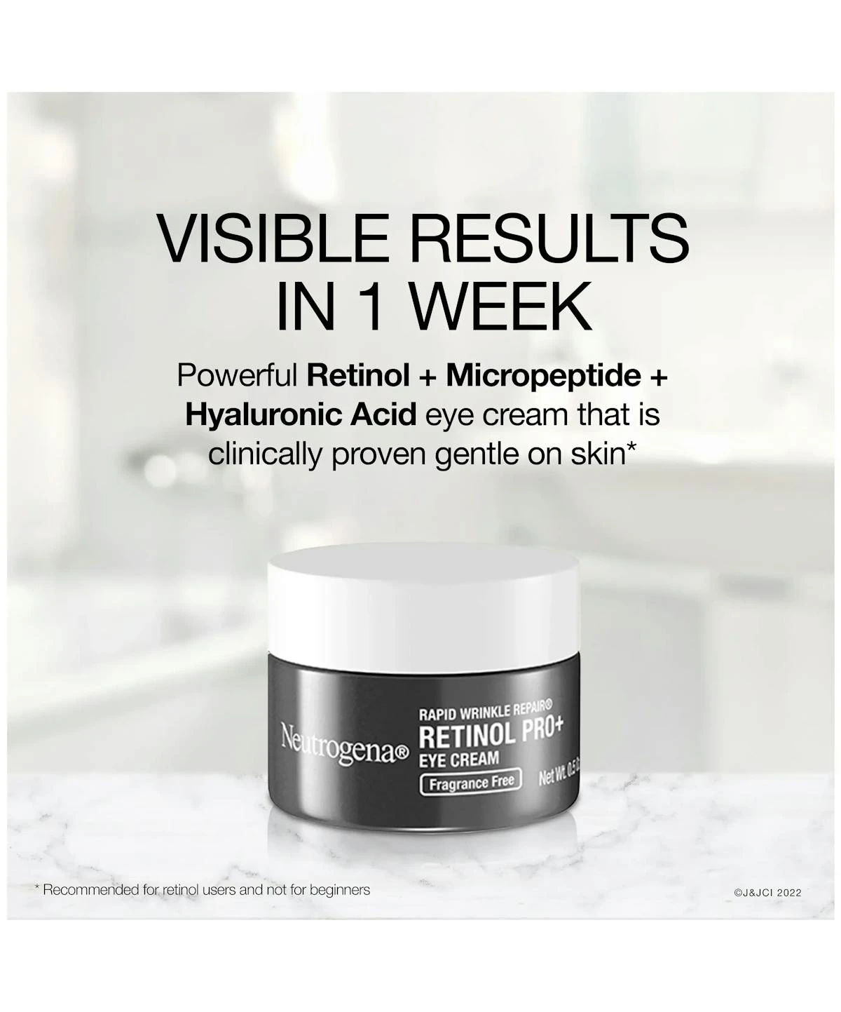 Neutrogena Rapid Wrinkle Repair® Retinol Pro+ Eye Cream visibly improves the look of wrinkles and dark circles around the eyes while hydrating skin. Formulated with pure retinol, micropeptide and Hyaluronic Acid, this ophthalmologist-tested eye cream is clinically proven gentle on skin* and boosted with patented technology for visible results. This lightweight, non-greasy eye cream was shown to provide visible improvement in fine lines, dark circles, crow’s feet and wrinkles around the delicate eye area.