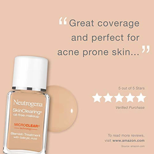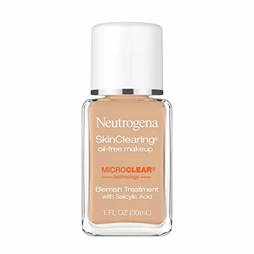 1-fluid ounce of Neutrogena SkinClearing Acne Fighting Liquid Foundation Makeup with Salicylic Acid Acne Medicine | Formulated for acne-prone skin, it is the first and only liquid makeup foundation with MicroClear technology that not only treats blemishes, but helps prevent emerging acne breakouts for clearer skin | Liquid makeup provides natural and breathable coverage, controls shine, and is designed for acne-prone skin | This acne fighting foundation contains salicylic acid acne medicine to provide fast acne relief and help fight acne breakouts | Developed by dermatologists and designed for acne-prone skin. This acne foundation is formulated to be oil-free, hypoallergenic, and non-comedogenic