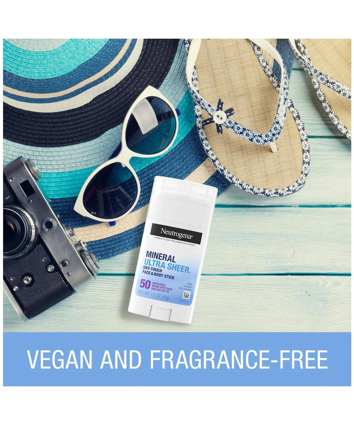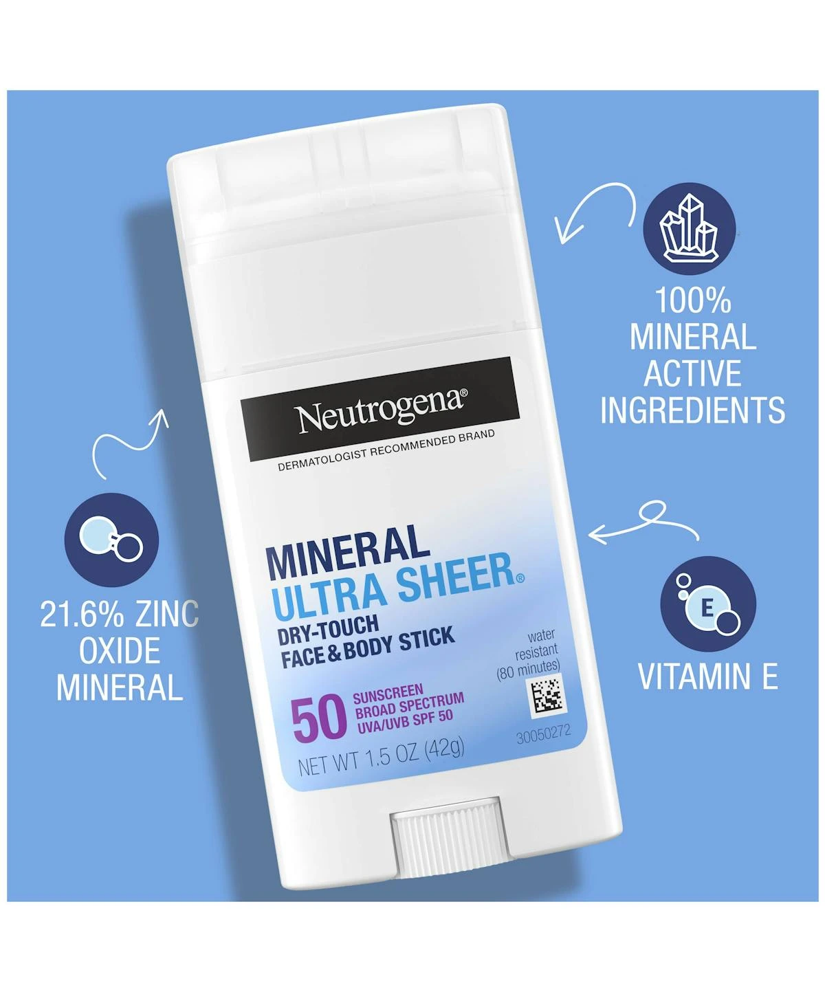 Fend off harmful UVA/UVB rays and the signs of aging skin. Neutrogena® Ultra Sheer Mineral Face & Body Stick with 100% Mineral Actives protects skin with broad-spectrum SPF 50. It’s a perfectly portable and easily swipeable sunscreen stick that leaves no white cast behind. This mineral sunscreen contains 21.6% zinc oxide from natural sources and vitamin E, which means it’s gentle enough for sensitive skin. Plus, our dermatologist-recommended formula leaves skin feeling soft and smooth every time you use it.